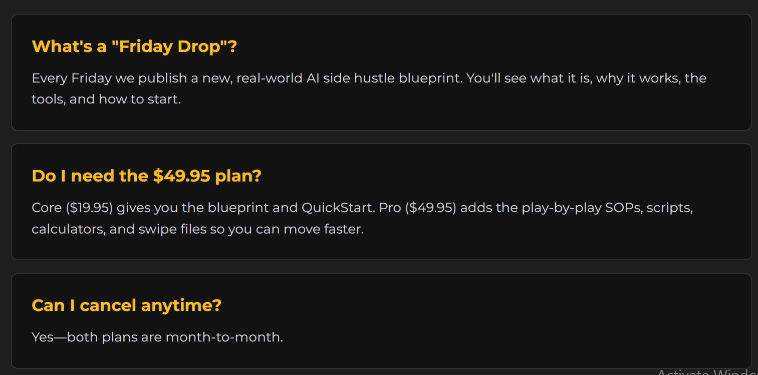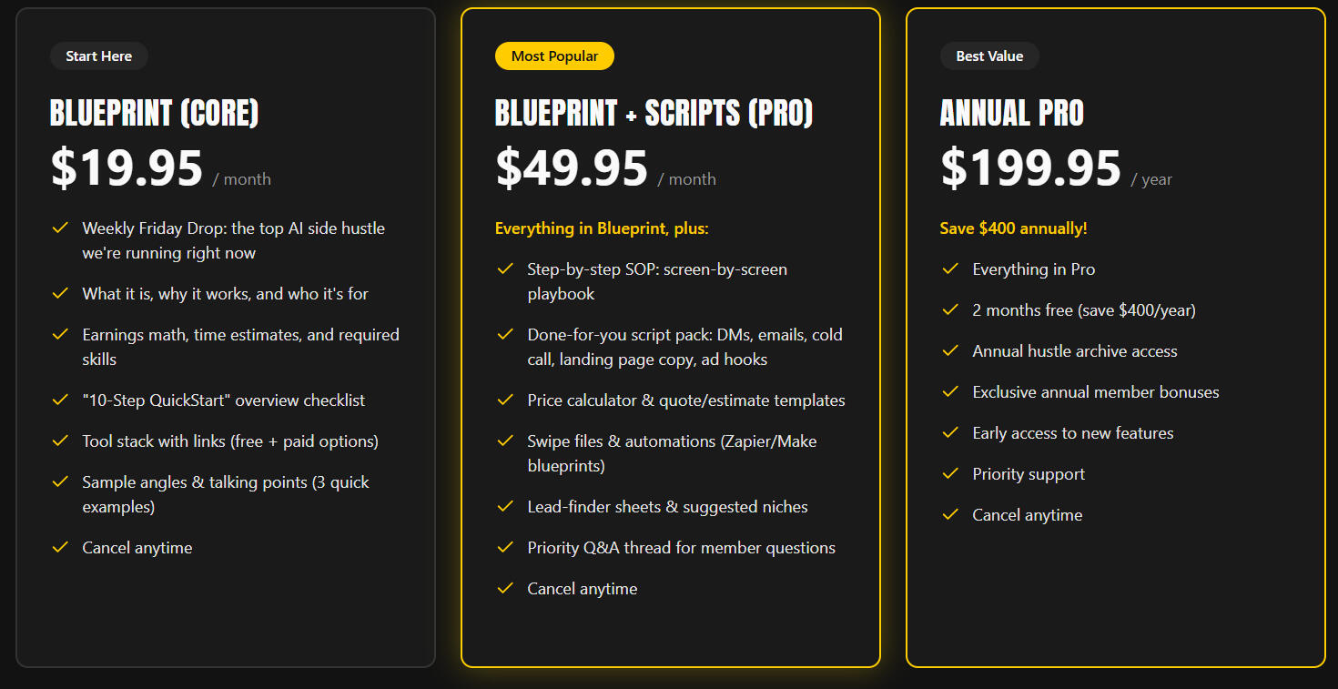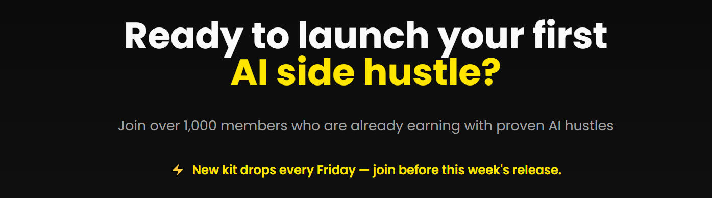 Real, actionable AI side hustles. No $3,000 "guru" course—just month-to-month access that actually helps you execute.